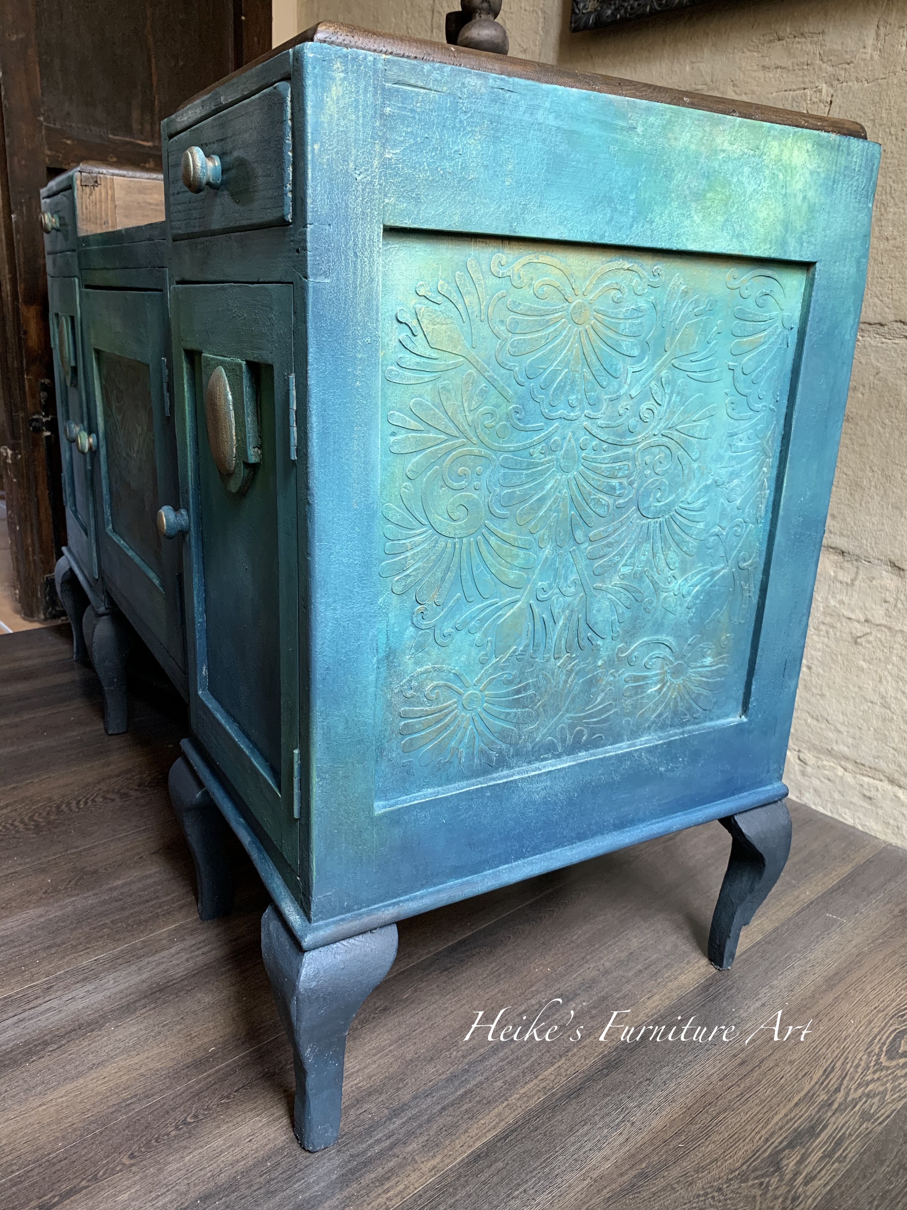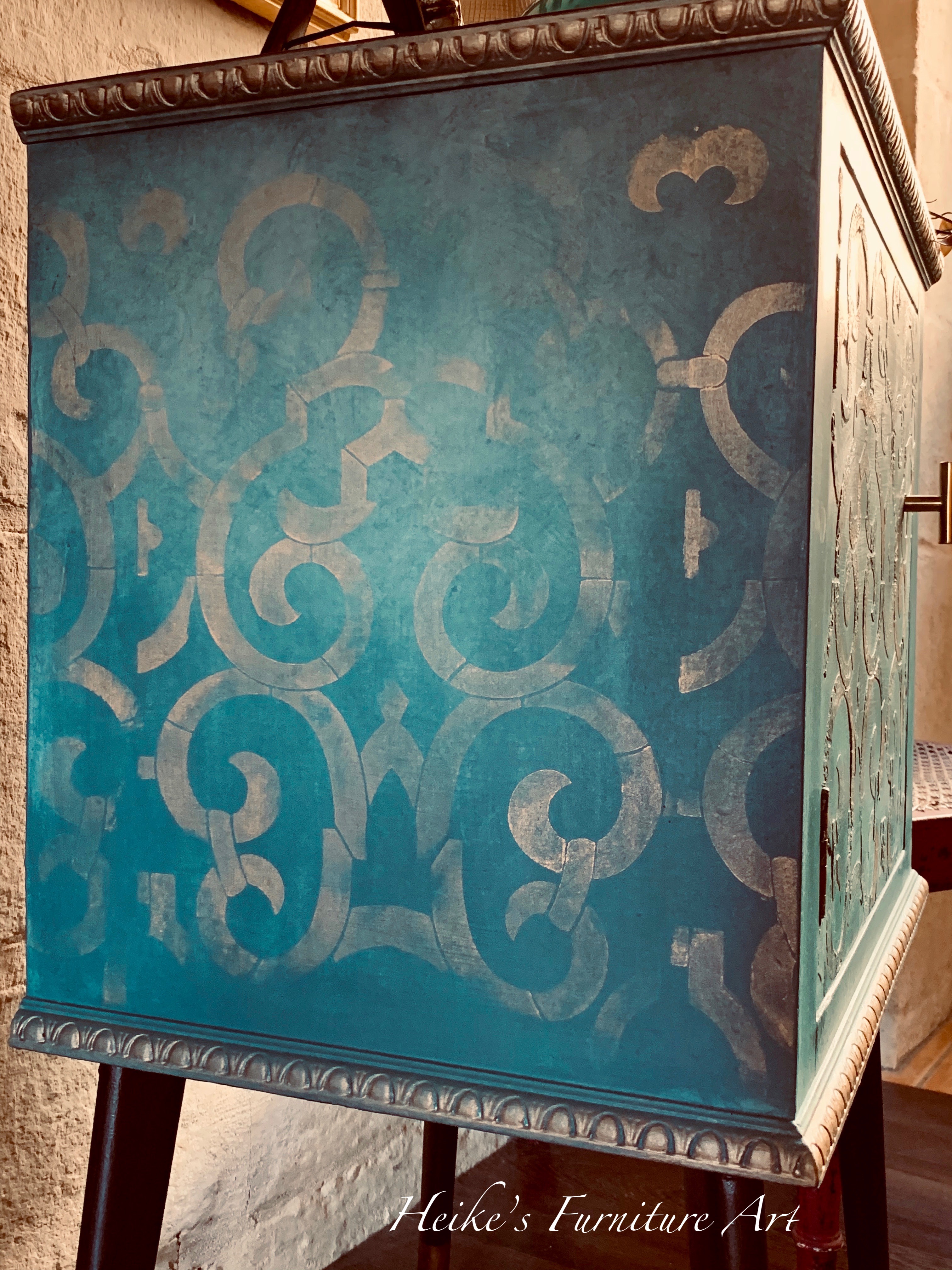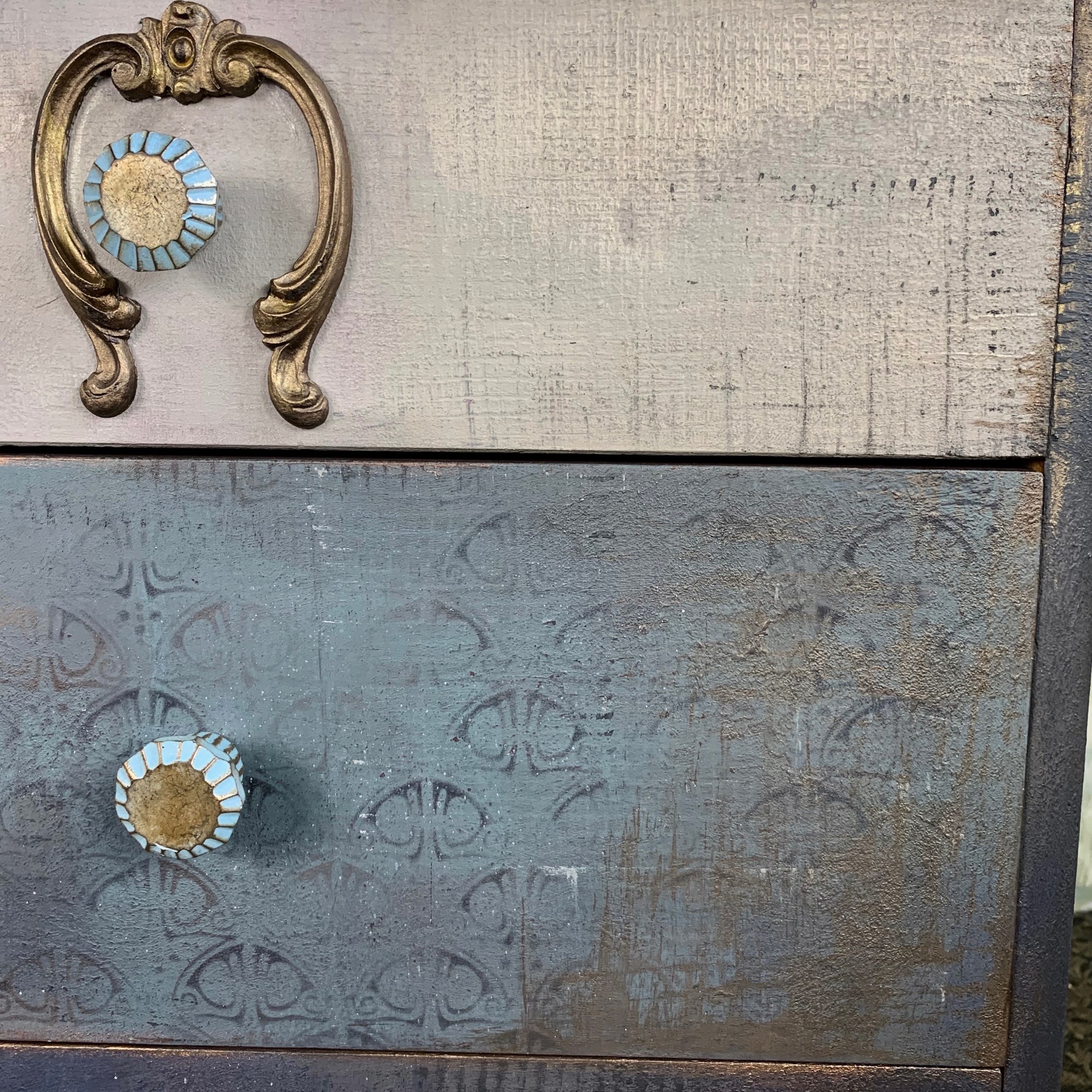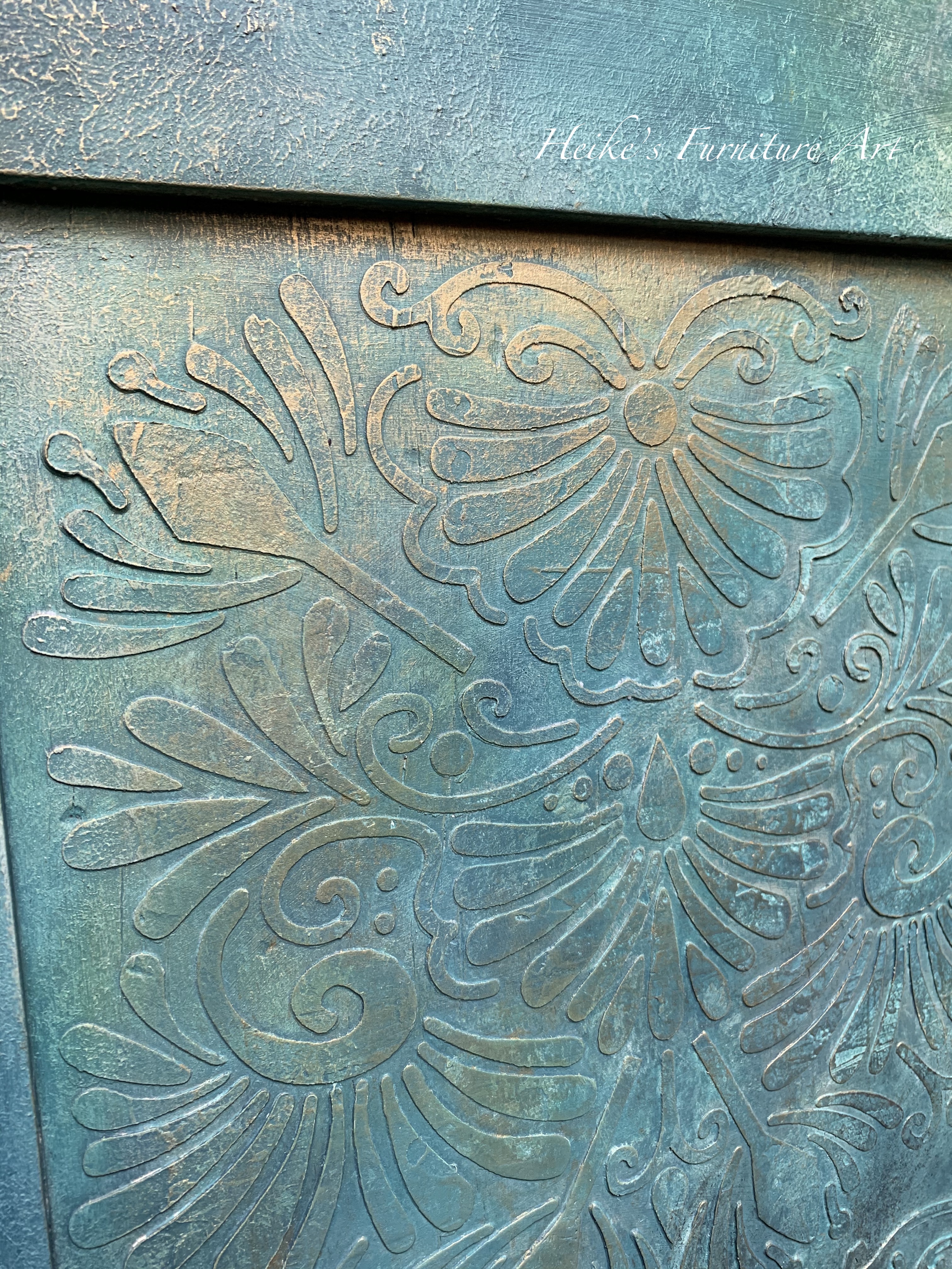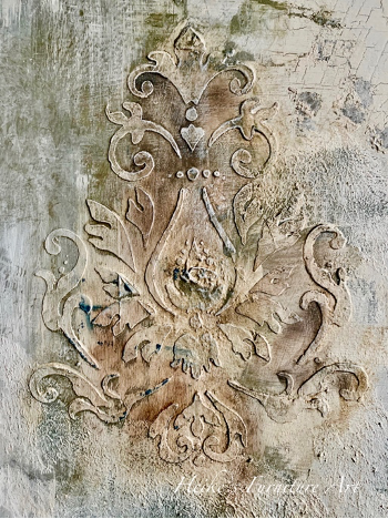 For the raised stenciling you may use different mediums such as joint compound or paint with a texture additive medium. I like using both, depending what I have on hand at the moment. Paint, waxes, powders…. catch in the nooks and crannies achieved with the stencil. Love it!