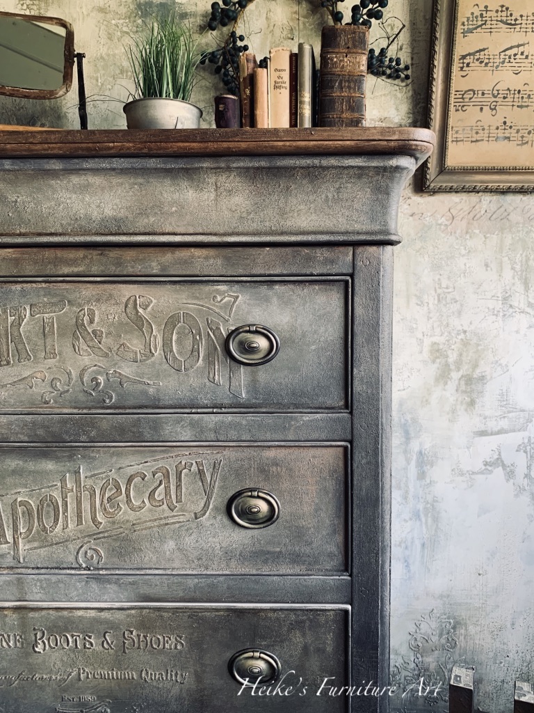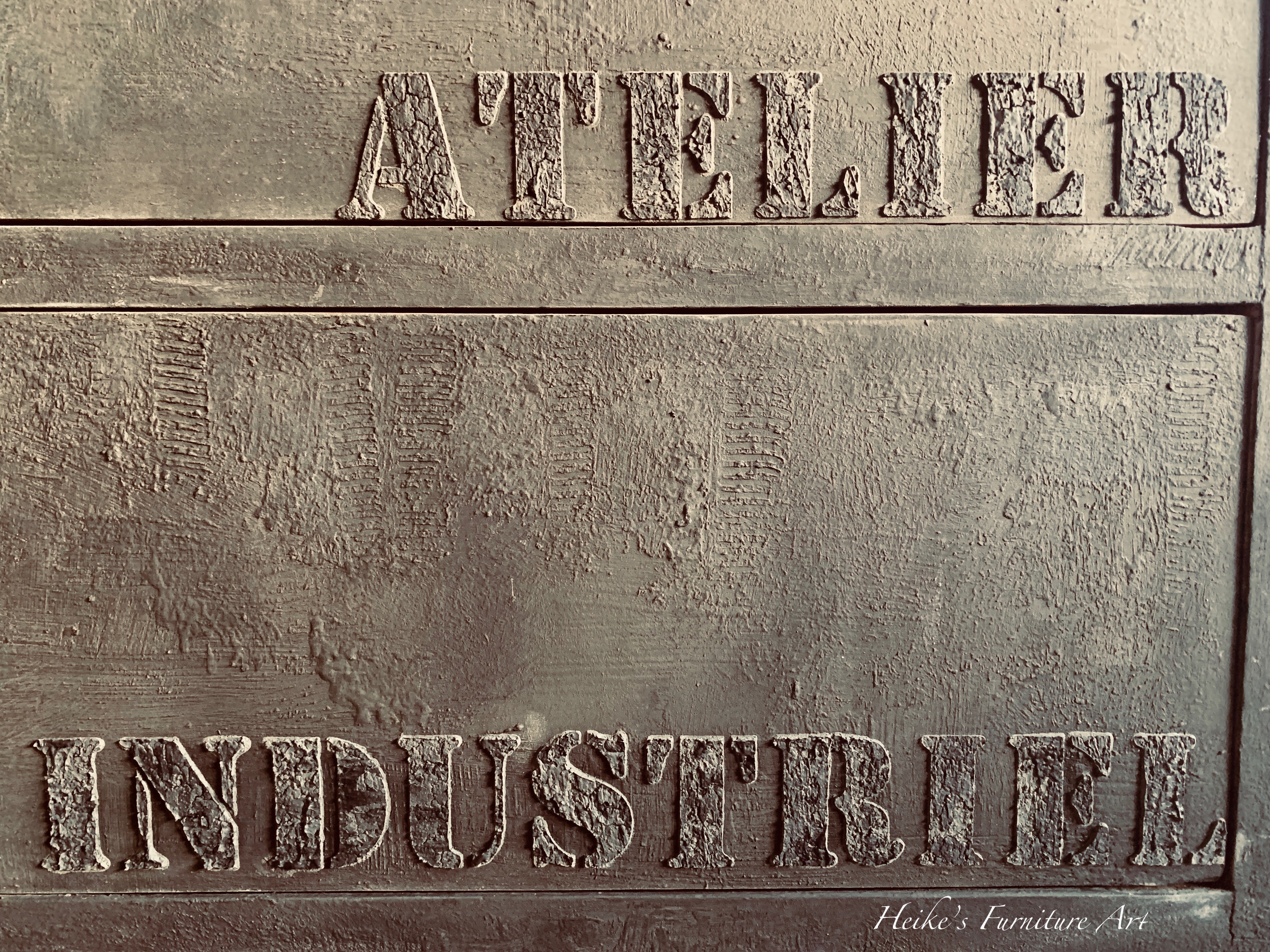 Several layers of medium create a heavy raised stencil. You can also add some very fine sand medium for example to achieve this look. Here I used a thick but workable mixture of paint and Sea spray (a Dixie Belle texture additive) let it dry and then layed my stencil over the existing dry design and added another mixture. This time adding a bit of sand medium.
