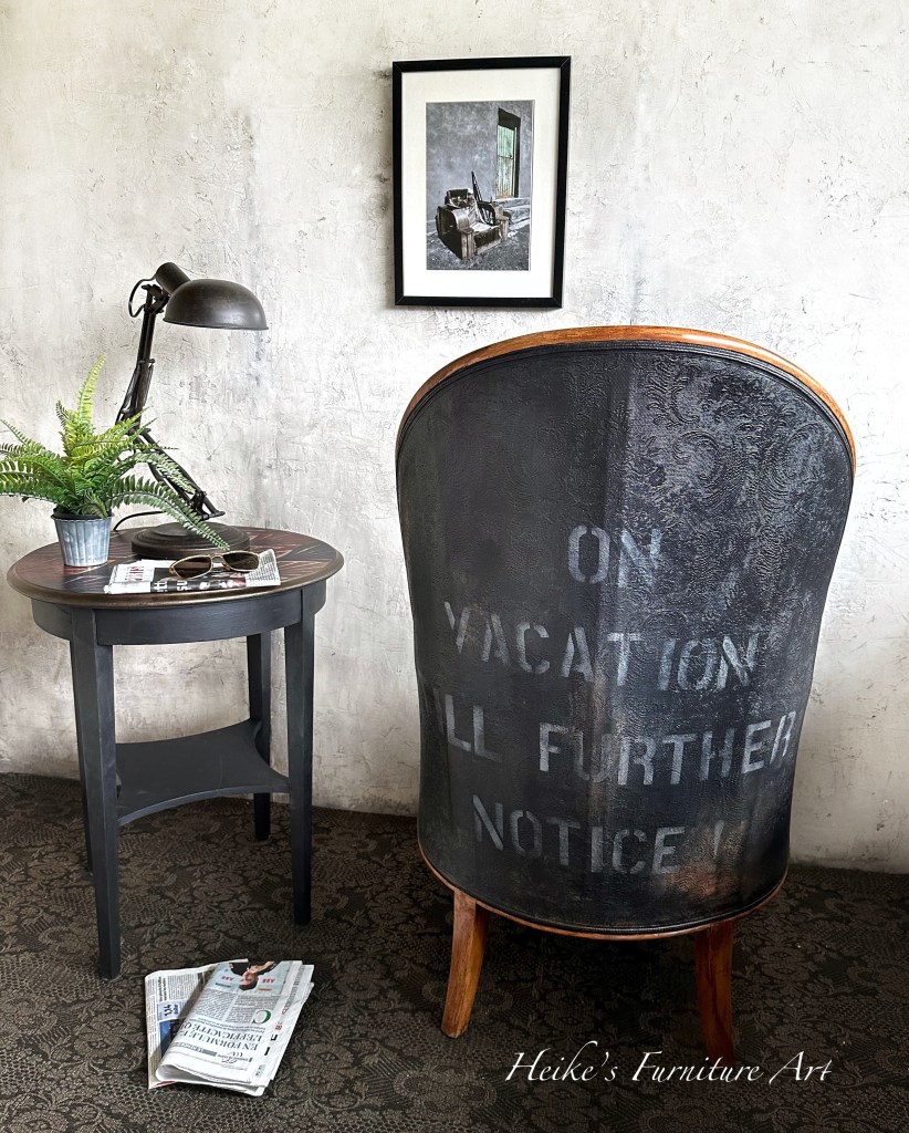 This piece has been sitting and waiting for me to find some time to transform it. I had known from the beginning that I wanted theย ย โold leather industrial lookโ. I could envision an armchair that had been used for many many years in a gentlemanโs club where they smoke their cigars whilst meeting and chatting.ย Our interior is on the industrial side so what better finish. I was inspired by a similar finish that my friend Jonathon Marc Mendes did. He’s an amazing artist.