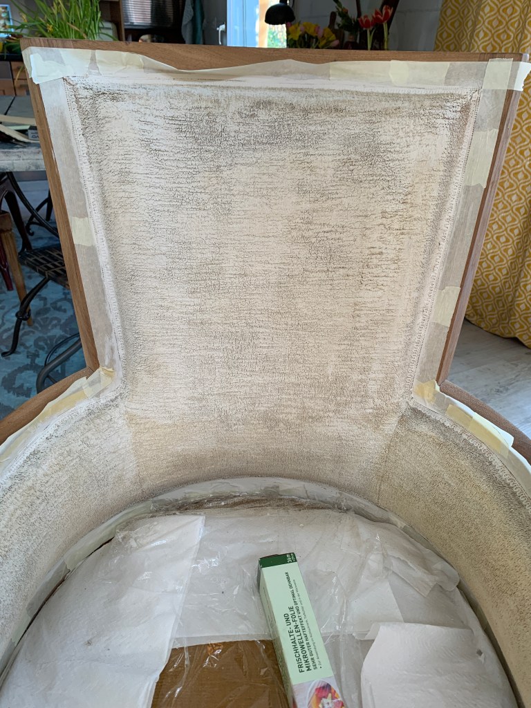 I started building up my layers and used a sanding pad between each coat to remove and smooth any bumps and brush strokes on the piece. (I used 400 grid paper) I repeated this process 3 times. You might need more layers depending on the design of the fabric you have. Here is what it looks like at this stage.