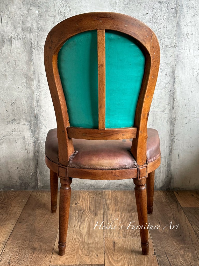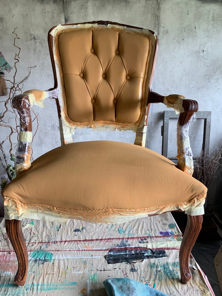 The chair wasnโt fabric as you can see. Just plain ugly artificial leather look but to be honest in quite good condition. Easy painting for this one. You have to know that itโs really easy to paint a fabric chair with chalk paint. Just use cotton or any flat finish. And best avoid heavy or velvet fabric.