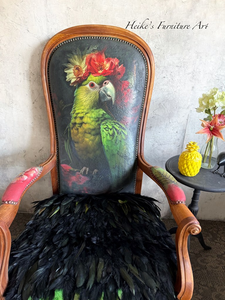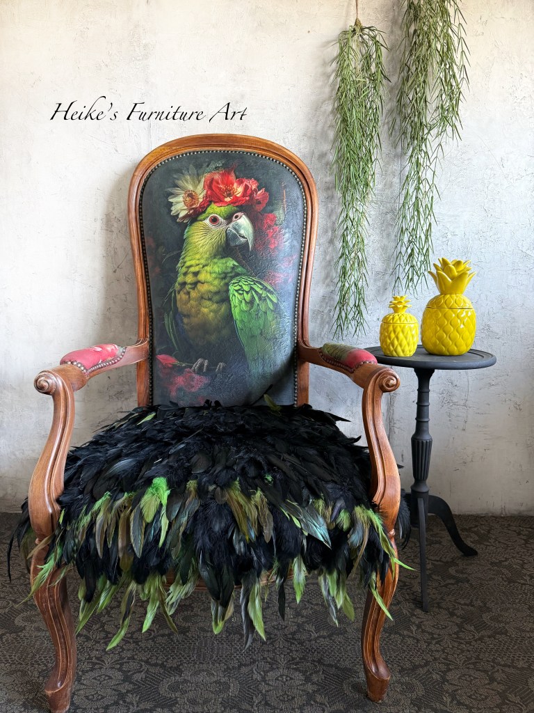 Fauteuil vintage peint à la main, chaise décorative, œuvre d’art représentant un corbeau, meuble design, meuble d’art recyclé, décoration d’intérieur unique, chaise peinte unique en son genre, motif couronne fleurs perroquet, pièce d’art de collection