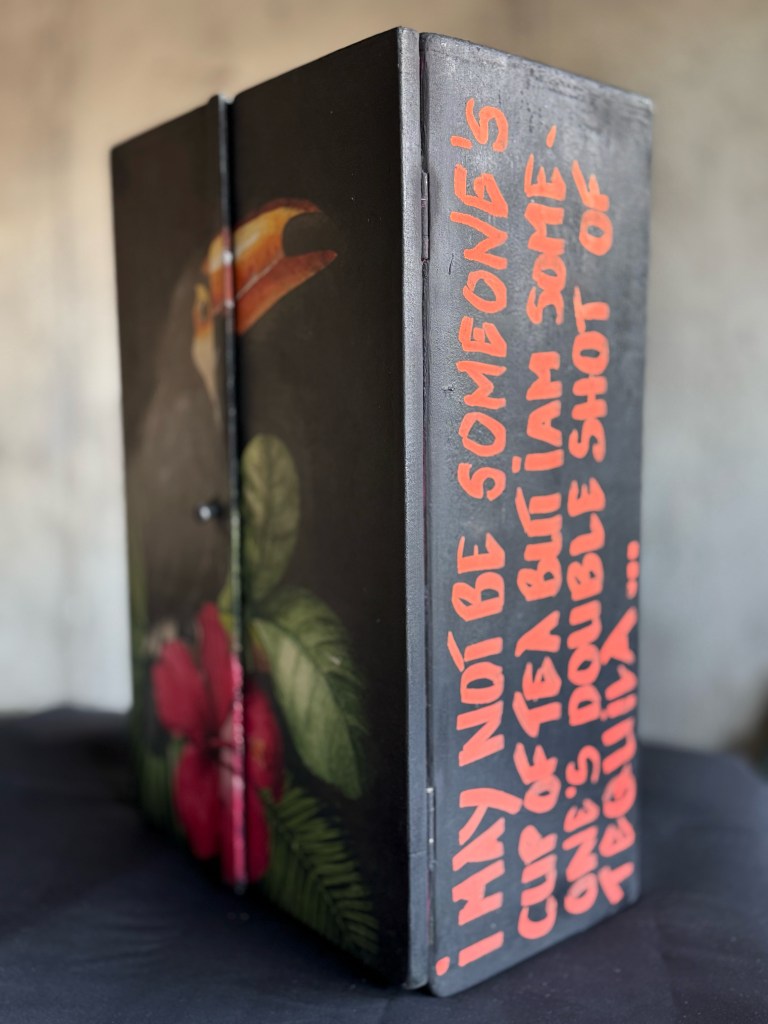 Meuble d’appoint, table de nuit vintage, petite commode design, table de chevet, meuble entrée, salon, chambre, moderne, meuble décalé et éclectique, création unique, table de chevet artistique, meuble Frida Kahlo, mobilier d’art, décoration artistique