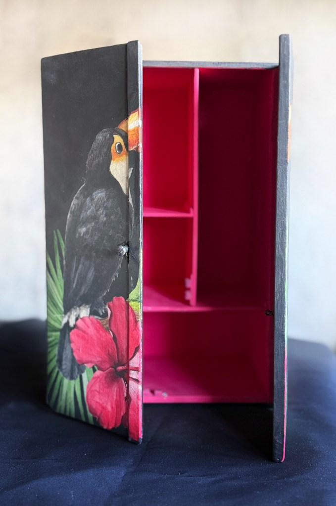 Apportez une touche d’humour et de couleur à votre intérieur avec cette petite armoire de pharmacie décorative, entièrement peinte à la main.