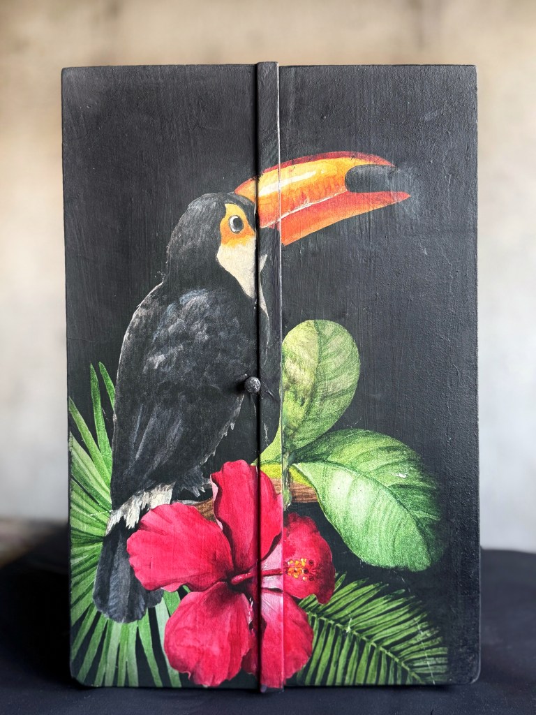 Peinte à la main dans des tons chauds d’orange et de rouge, il apporte chaleur et caractère à n’importe quel espace. La finition vieillie et patinée met en valeur son côté vintage, tandis que les motifs subtils au pochoir sur les côtés ajoutent une petite touche artistique.
